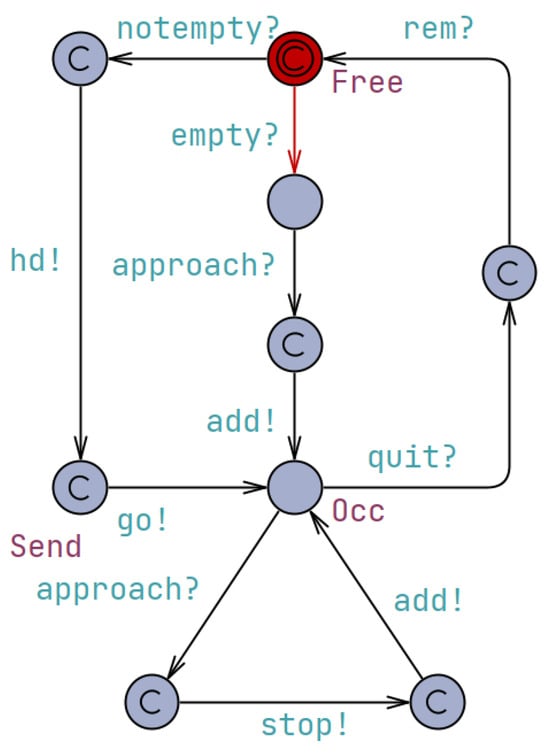 The controller, as modeled in Figure 4, serves as a central component responsible for managing and coordinating the actions of the system. It interacts with the drones and the queue to ensure proper synchronization and control. The controller automaton consists of several locations representing different states. The “Free” location indicates that the controller is available and not engaged in any specific task. The “Occ” location represents the controller’s occupation or engagement in a particular action. Additionally, the controller may have other locations, such as “Coordinating” or ”Monitoring”, which represent its involvement in specific coordination or monitoring tasks within the system. The transitions between locations are labeled with synchronization events denoting the communication and coordination with other components. For example, the “notempty?” and “empty?” synchronizations indicate the controller’s interaction with the queue, checking whether it is not empty or empty, respectively. These synchronizations allow the controller to be aware of the queue’s state and make decisions accordingly.