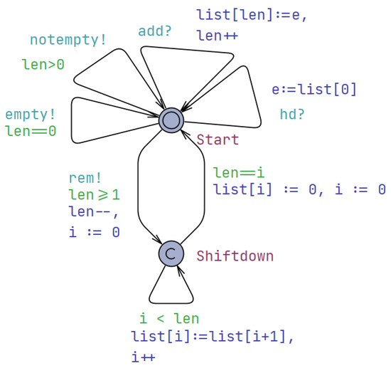 The queue automaton presented in Figure 5 consists of two locations: “Start” and “Shiftdown”. The “Start” location represents the initial state of the queue, while the “Shiftdown” location represents the process of shifting down elements in the list. The transitions between locations define the actions and conditions of the queue. They are labeled with guards, assignments, and synchronizations. The guards specify conditions that must be met for a transition to be taken. For example, the guard i < len ensures that the variable i is less than the current length of the list. The assignments update the values of variables. For instance, the assignment list[i] := list[i + 1], i++ shifts down elements in the list by assigning the value of list[i + 1] to list[i] and incrementing i by one. The synchronizations indicate the interaction and synchronization with other components. The “rem!” synchronization represents the removal of an element from the queue, “empty!” indicates that the queue is empty, “add?” represents the addition of an element to the queue, and “hd?” denotes a request to retrieve the first element from the queue. The automaton includes an initial state set to the “Start” location, indicating that it starts in an idle state.
