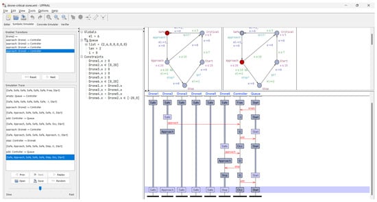 Symbolic simulation in our case study was performed using the timed automata modeling language supported by the UPPAAL tool. We specified the behavior of the various components of the drone fleet management system, such as the drones, the control center, and the communication infrastructure, as interconnected timed automata. These automata models captured the discrete state changes, timing constraints, and synchronization mechanisms governing the system’s operation.