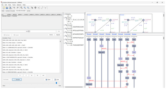 Symbolic simulation is a technique employed to analyze systems with large state spaces efficiently. In symbolic simulation, sets of states are represented symbolically, allowing for the exploration of various scenarios and the generation of traces to observe the system’s behavior. It abstracts away the precise timing details between consecutive events and focuses on the overall behavior of the system. Symbolic simulation is particularly useful when dealing with complex interactions and large-scale systems. In our case study, we utilized the symbolic simulator provided by UPPAAL to perform symbolic simulation of the drone fleet management system. By representing sets of states symbolically, we could explore different scenarios and analyze the behavior of the system. We specified temporal logic properties, such as safety and liveness properties. Symbolic simulation enabled us to gain insights into the system’s dynamics, identify potential design flaws, and refine the system’s architecture for improved reliability.