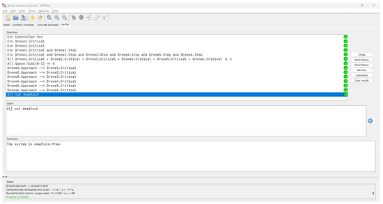 In this section, we present the results of the verification process for the drone system using the UPPAAL model checker. We have checked a set of properties to ensure the correctness and desired behavior of the system. Table 2 provides an overview of the properties considered in the verification process, along with their corresponding formulas and explanations. All the properties listed in Table 2 have been checked and verified to ensure the correctness and desired behavior of the drone system. The UPPAAL model checker was used to analyze the system and provide results for each property. Figure 8 displays the results of the verification process. Below, we provide an explanation for each property.