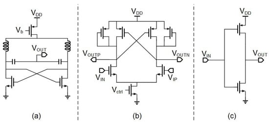 (a) Oscillation unit in LC-VCO and delay unit in (b) differential Ring-VCO and (c) single-ended Ring-VCO.