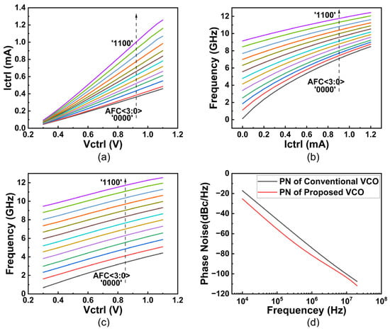 The simulation results of the proposed VCO are illustrated in Figure 3. In Figure 3a–c, the AFC code of the curves changes from “0000” to “1100” along the direction of the black arrow. The AFC codes for curves of the same color are also the same. When and differ, the variation in with is shown in Figure 3a, and the change in output frequency with is depicted in Figure 3b. In the proposed VCO, is not a constant value but varies with , which affects by adjusting . When an upward adjustment of the frequency tuning range is required, a smaller is selected, resulting in a larger slope of vs. (Figure 3a). At the same time, a smaller is selected. Since the oscillator and are on the same branch, the oscillator divides the voltage more and increases. From Equation (7), the slope of the output frequency vs. becomes smaller (Figure 3b). By choosing the appropriate and , it is possible to make the slope of vs. larger to the same extent as the slope of output frequency vs. is smaller, so that the slope of output frequency vs. is almost constant. In other words, smaller and larger values keep nearly constant.