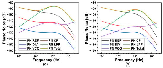 The simulation results of the overall noise of the PLL in integer-N mode are demonstrated in Figure 5. The results are obtained by post-layout simulation of phase noise for each module and then synthesized through MATLAB R2021a. The overall phase noise of the proposed PLL shown in Figure 5b is lower than that of the conventional PLL shown in Figure 5a. At low frequencies, the phase noise of the VCO is reduced, making the total phase noise lower. At high frequencies, since the noise transmission of the LPF is positively correlated with , the noise reduction in the LPF at high frequencies makes the total phase noise lower.