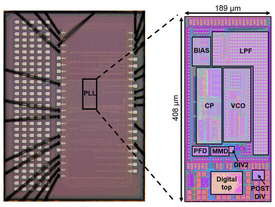 The proposed fractional-N PLL with a small area and low power consumption was implemented using 12 nm FinFET technology. Figure 6 shows a micrograph of the chip, with the PLL occupying an area of 0.078 mm2. The PLL layout is shown in the right part of the figure. The LPF, which utilizes a large number of capacitors and resistors, occupies the largest area. Considering the requirements for bandwidth and stability, it is difficult to reduce its area. The oscillator in the VCO only occupies a small area, protected by guard rings to enhance its stability.