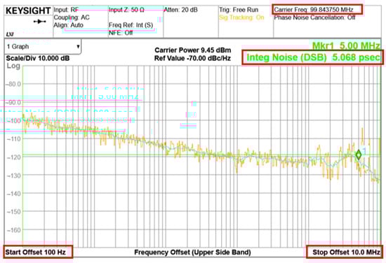 Figure 9 shows the phase noise performance of the PLL output in fractional-N mode. The orange curve is composed of the actual measured values, which are then fitted to obtain the green curve. The start and stop frequencies, carrier frequency, and RMS jitter are likewise marked in the red rectangle. The actual output frequency of the PLL is 3.19 GHz and the test frequency is 99.84 MHz after 32 divisions. The RMS jitter integrated from 0.1 kHz to 10 MHz is 5.068 ps and the measured phase noise is −123.09 dBc/Hz at 1 MHz offset frequency.