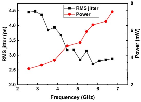 The RMS jitter and power consumption in integer-N mode across the complete output frequency range are plotted in Figure 10. Within the operational range, the RMS jitter is consistently maintained below 4.5 ps, while power consumption remains below 7.5 mW. Performance comparison between the proposed PLL and other PLLs in recently reported work is summarized in Table 2. The proposed PLL demonstrates advantages in power consumption and area while maintaining low RMS jitter and high output frequency.