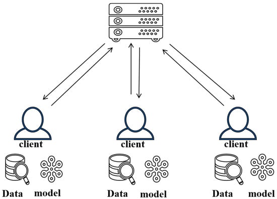 Federated learning enables decentralized machine learning services by distributing the training phase across participants. Localized model training allows users to avoid exposing their data to enterprises or other participants, giving federated learning a clear advantage in client data privacy protection. The federated learning architecture is shown in Figure 1. In a complete training process, the central server initially transmits the initial global model to multiple clients. Upon receiving the global model, clients utilize their local training datasets to train local models. Subsequently, clients upload their local update parameters to the central server. Finally, the central server further aggregates and averages these parameters to obtain a new global model.