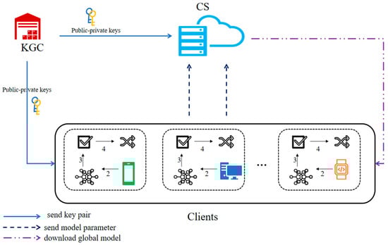 Secure use of personal healthcare data is critical in the current healthcare system. In traditional machine learning methods, data collected by mobile devices are first uploaded to cloud servers or data processing centers before being processed. For example, smart wearable devices and smartphones can continuously detect a user’s heart rate, blood pressure, etc., and can send these data to a medical center for further diagnosis. However, due to the explosive growth of IoT data on the web, transferring large volumes of IoT data to remote servers may not be feasible due to the network resources required and the latency incurred. The substantial volume of health monitoring data stored in cloud centers presents a significant risk of privacy breaches, given its sensitive nature involving personal privacy. Addressing these challenges, distributed machine learning [] has emerged as a prominent research area. Compared with traditional machine learning methods, distributed machine learning enables training of larger models on massive data but is still vulnerable to security and privacy leakage. Secure and open access to these isolated data centers becomes the biggest challenge when managing a central global model. The proposal of federated learning (FL) [] has marked a new paradigm for machine learning, where multiple data holders (such as cell phones, IoT devices, or healthcare organizations) collaborate to train a model without sharing the data, exchanging only the training parameters at intermediate stages. Chen et al. [] designed a migrating federated learning framework for wearable medical device healthcare with good scalability. In Wu et al. [], a federated learning framework for home health monitoring was designed to enable personalized monitoring. Although the feature of uploading only the gradient without uploading the raw data makes federated learning naturally protective of users’ private data, there is still a risk of privacy leakage in federated learning scenarios []. First, untrustworthy servers have the right to access a large amount of auxiliary knowledge (e.g., model structure, initialization parameters, etc.) of each participant’s locally trained model, as Zhu et al. [] found that a malicious attacker was able to steal the raw training data based on the partially updated gradient information. Second, federated learning participants themselves are untrustworthy, and malicious participants colluding with untrustworthy servers can reveal more precise private information about other users or tamper with computational results []. Also, due to limited broadband costs and other communication constraints, some edge nodes may not be able to connect directly to the global learning model, especially in large-scale and complex mobile edge networks. The global model is exclusively distributed to the clients engaged in the network []. Mobile devices frequently operate offline, posing challenges for maintaining direct connectivity between the global model and the client model []. Unreliable servers can attempt to infer personal information from users’ local updates, posing a threat to users’ privacy.