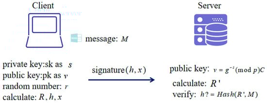 The traditional authentication mechanism consists of two entities, the user and the server. The server has all the user’s identity information, and hence, it is easy to obtain the user’s information. At the same time, the signature information that the user sends to the server for authentication may be intercepted by the attacker to compute the user’s identity information, resulting in the leakage of the user’s information. Our proposed Schnorr zero-knowledge-based authentication mechanism can better solve the above problems. Zero-knowledge proof [] refers to the ability of a prover to convince an authenticator that an assertion is correct without presenting any useful information to the authenticator. The Schnorr mechanism [] is a zero-knowledge proof mechanism based on the discrete logarithm puzzle. In the authentication module of this paper, the client C is required to prove to the server S that it possesses a digital signature ( and ) on the identity information without revealing any useful information about and to prove the authenticity of the identity. The public parameters are as follows: is any prime number, the generating element is , the public key is , and the possessed private key is . The authentication process is shown in Figure 3 and described as follows.