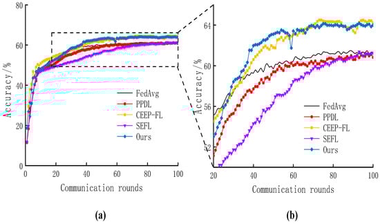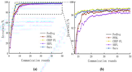 Comparison Experiments: The proposed scheme used FedAvg [], PPDL [], CEEP-FL [], and SEFL [] as comparison experiments. Among them, FedAvg is the original federated learning scheme without adding privacy preservation, PPDL is the classical scheme that provides privacy preservation to federated learning frameworks using homomorphic encryption, and CEEP-FL and SEFL are the most recent schemes that currently improve the efficiency on the basis of considering privacy preservation in federated learning scenarios.