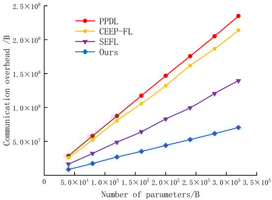 Communication overhead is a major challenge in federated learning. Employing encryption schemes during training increases both communication and computation overhead, thereby affecting training efficiency. To evaluate the advantage of our approach in terms of communication overhead, experiments compared the communication overhead of different approaches under the same number of client environments. The experiments selected encryption-based federated learning schemes PPDL, CEEP-FL, and SEFL as comparative experiments, with model update parameters represented in double-precision floating-point format. As shown in Figure 6, in a round of global updates, the increase in model weights resulted in higher communication overhead due to the PPDL and CEEP-FL algorithms encrypting all plaintext parameters using Paillier homomorphic encryption before uploading them to the server. On the other hand, the SEFL algorithm reduced the number of parameters that needed to be uploaded by approximately 40% through pruning techniques, thus reducing communication overhead. In contrast, our scheme compressed the parameter volume by quantizing them naturally before uploading them to the server, reducing communication overhead by up to approximately 70%, demonstrating significant advantages.