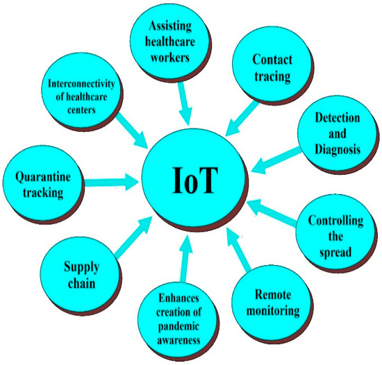 IoT technology, which makes it easier to link common products to the internet and create a massive network of interconnected gadgets, has quickly become a groundbreaking topic in computer science. The proliferation of IoT devices can be attributed to two factors: the progress made in wireless networking technology and the growing need for efficiency and automation in various industries. There are many different industries using this technology, and more industries are predicted to use it in the future. IoT is gradually permeating society and is now especially important in domains like security, smart homes, SC, healthcare, and agriculture, among others. The development of networking and technological capacities highlights how important developing technologies are to the global spread of IoT. Though it has promise, there are several obstacles, such as privacy and security issues, that researchers need to overcome with creative thinking. With networking and technology developments fuelling the IoT’s growth, its uses will expand and become more deeply ingrained in society. The emergence of IoT devices, their common uses in healthcare, agriculture, and SC, and the future possibilities of this exciting sector have all been covered in their study [10]. During the COVID-19 pandemic, IoT sensors proved invaluable in assisting medical professionals in keeping a closer eye on vital indicators that, if changed promptly, might potentially save lives [29]. Researchers can identify more methods to progress this field of study by looking at these IoT device applications in the healthcare sector [25]. In the recent COVID-19 pandemic, IoT technologies’ contributions included, but were not limited to, prompt identification and diagnosis of the infection, prevention and management of its spread, monitoring of patients under quarantine, contact tracing of affected individuals, support for medical personnel in obtaining supplies of food, medicine, and medical equipment, remote patient monitoring, and data collection [10,30], as shown in Figure 3.