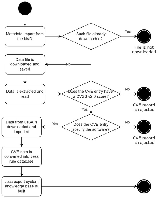 After the file extraction function is completed, the function of reading JSON files and converting the CVE data contained in them to the Jess ES knowledge base is initiated. During this phase, only those CVE records that have CVSS V2 estimates with the specified vulnerable software version (CPE value) are sampled when building the Jess ES knowledge base. That is, if the scanned CVE record does not have a CVSS V2 estimate, it is rejected, and if a CVE record has a CVSS V2 estimate but does not have specified CPE fields, the record is also rejected and not included in the forming ES knowledge base. During data conversion, data from CISA’s Known Exploited Vulnerabilities Catalog are also downloaded and loaded, with which it is checked whether the converted CVE record is included in this catalog; if it is—the CVE record is marked accordingly. Even during the conversion of CVE data, vulnerable software information is extracted from CPE data contained in CVE: manufacturer, name, and version.