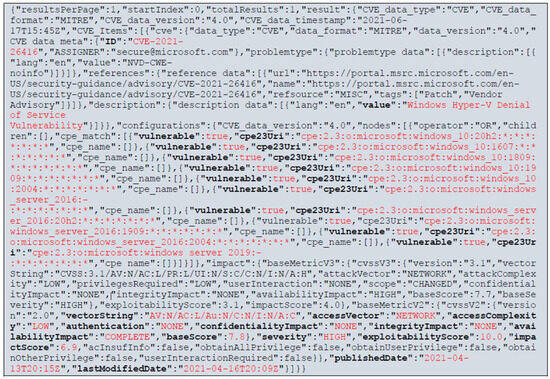 The National Vulnerability Database (NVD) is another source from which CVE data can be freely downloaded in JSON format or via an API. This source provides CVE data with additional information such as vulnerable software or hardware versions, CVSS Vulnerability Scoring System information, and other useful attributes that can be used to assess the security risks of the software in use, making it useful information for information security purposes and risk analysis. The CVE information provided by NVD is expanded and more detailed; therefore, the data provided by it are selected as a source for the automated knowledge base formation of an expert system for information security risk analysis.