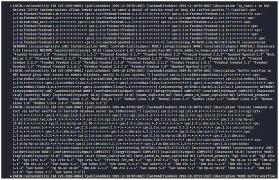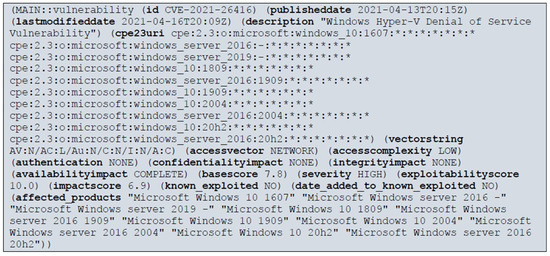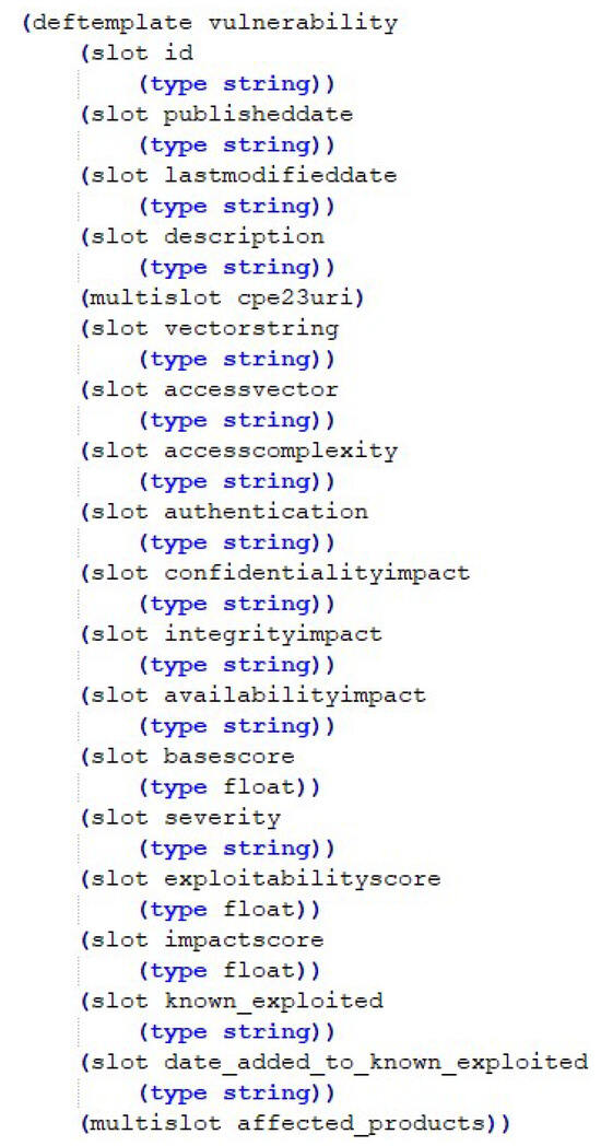 The file “cve_jess_kb.dat” created by the program prototype is an automatically formed ES knowledge base, which contains information about known software vulnerabilities (CVEs) and their known exploitation in public space (see Figure 5).