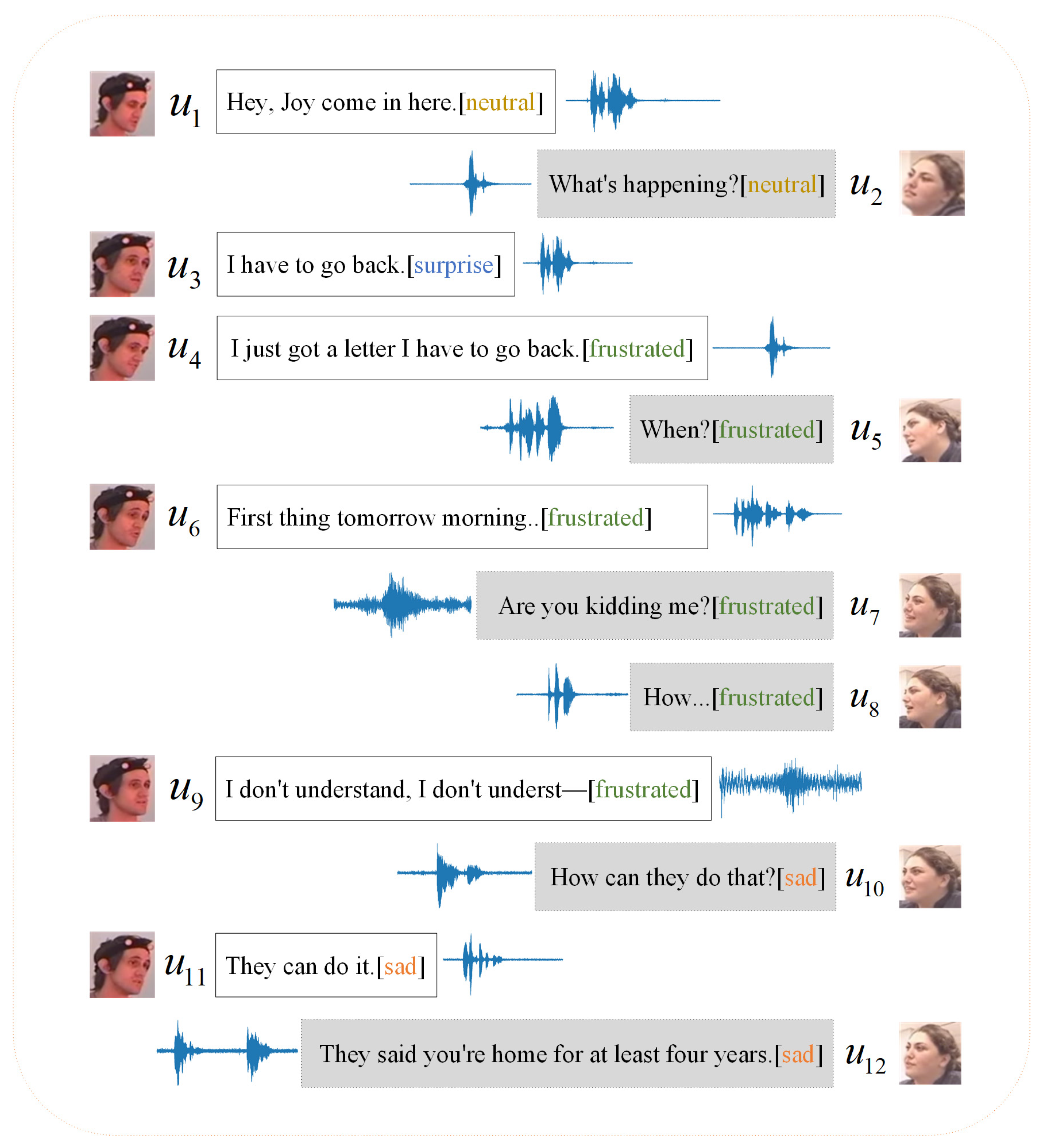 - Hazarika, D.; Poria, S.; Mihalcea, R.; Cambria, E.; Zimmermann, R. Icon: Interactive conversational memory network for multimodal emotion detection. In Proceedings of the 2018 Conference on Empirical Methods in Natural Language Processing, Brussels, Belgium, 31 October–4 November 2018; pp. 2594–2604. [Google Scholar]