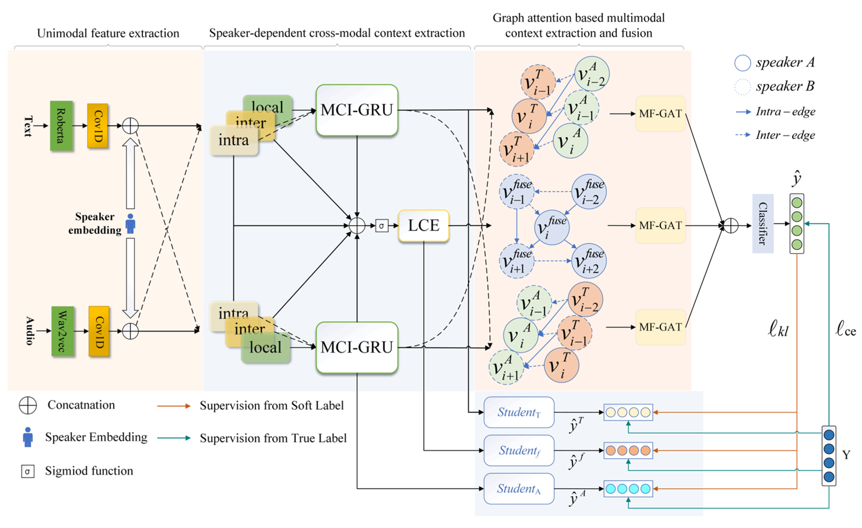 - The new GRU structure named MCI-GRU is designed, which not only retains the speaker-dependent cross-modal long-distance conversational context, but also captures local cross-modal conversational context from recent neighboring utterances. The proposed MF-GAT module constructs three directed graphs representing different modality views, which aims to capture both the long-distance conversational context and temporal complementary information from other modalities. In addition, the self-distillation is introduced to minimize the semantic gaps between different modalities for achieving more satisfactory emotion prediction performance.