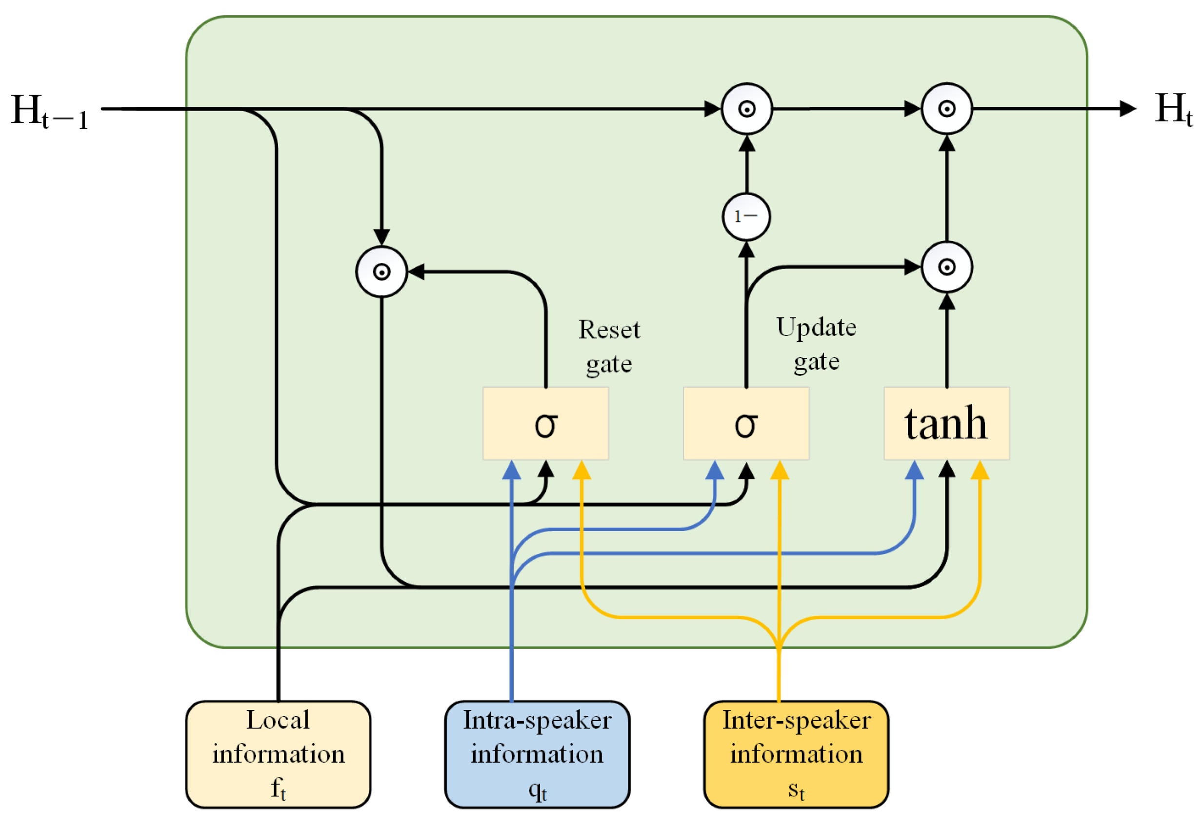- DialogueRNN [6] adopts three distinct GRUs, including Global GRU, Speaker GRU, and Emotion GRU, to capture conversational context, learn speaker identity information, and identify utterance-level emotions, respectively.