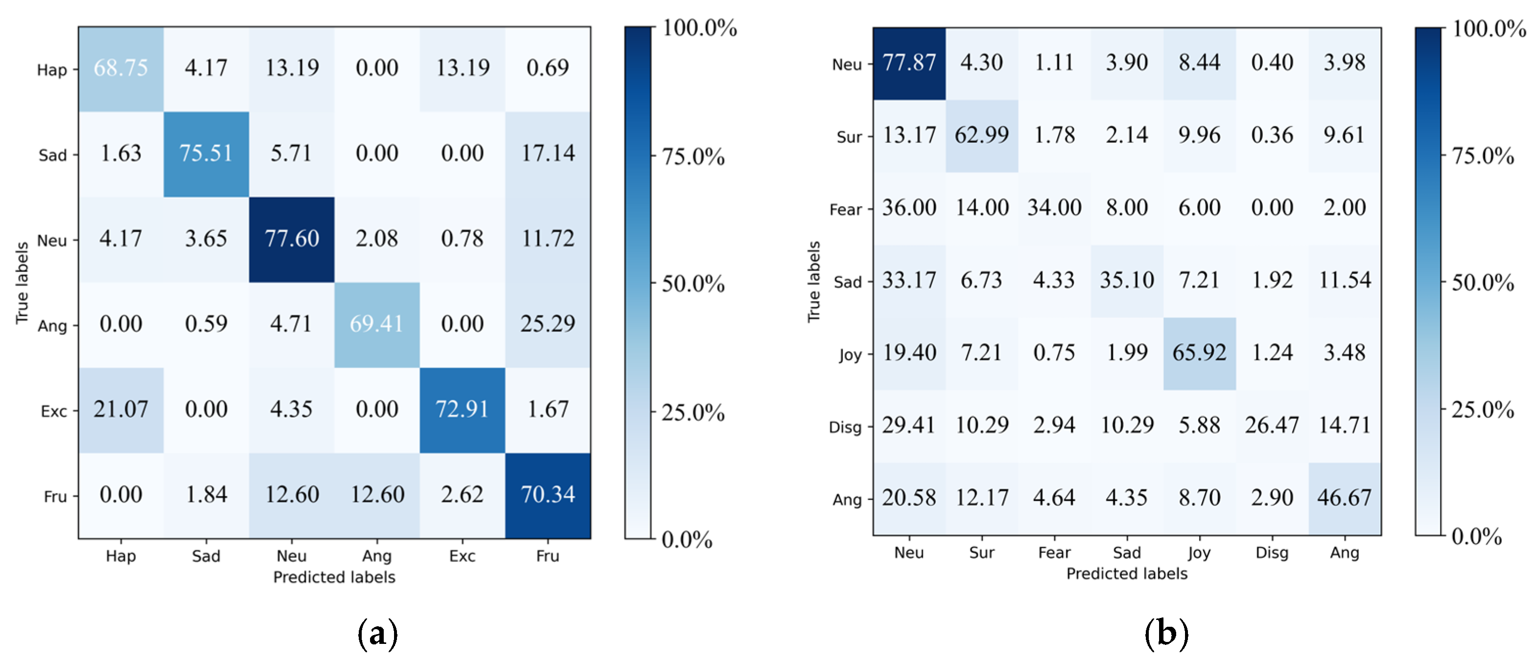 - Busso, C.; Bulut, M.; Lee, C.-C.; Kazemzadeh, A.; Mower, E.; Kim, S.; Chang, J.N.; Lee, S.; Narayanan, S.S. IEMOCAP: Interactive emotional dyadic motion capture database. Lang. Resour. Eval. 2008, 42, 335–359. [Google Scholar] [CrossRef]