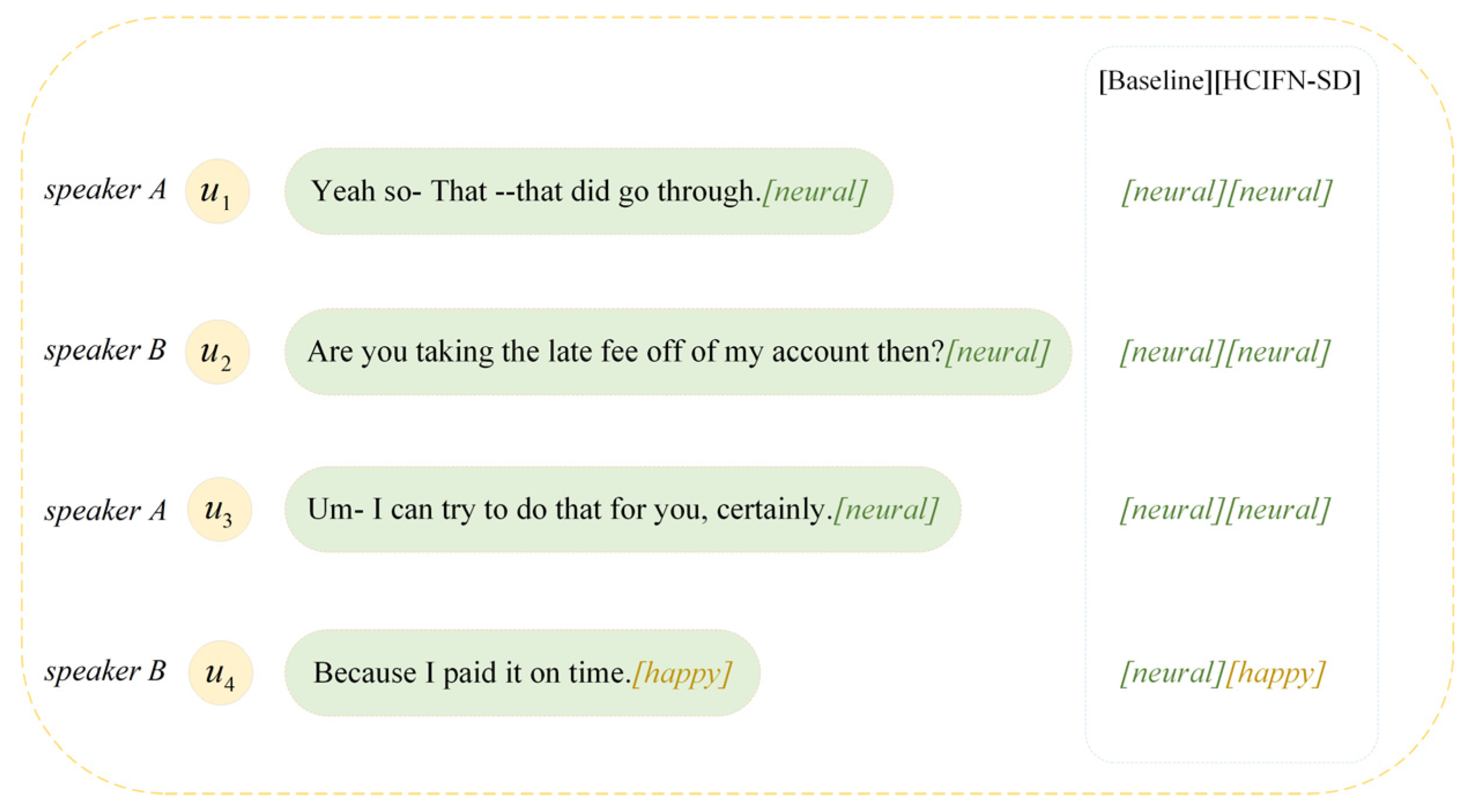 - Experimental results demonstrate that our proposed HCIFN-SD outperforms the existing mainstream ERC models and achieves new state-of-the-art records on the benchmark datasets. Furthermore, extensive ablation studies can systemically demonstrate the importance and the rationality of each component in HCIFN-SD.