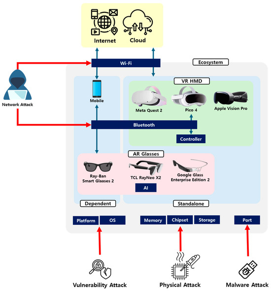 In this section, the XR device ecosystem is derived by analyzing XR devices, and the potential cybersecurity threats within this ecosystem are identified. The timeline of XR devices released by major XR companies over the past five years is summarized in Table 1. As presented in Table 1, big tech companies and companies specializing in XR devices generally release devices in the form of VR HMDs and AR glasses. Therefore, this study focuses on analyzing VR HMDs and AR glasses. Major XR devices were selected and analyzed using VR Compare [29], which provides information on the specifications and features of VR/AR devices and big tech companies. For the VR HMDs, Meta Quest 2, Pico 4, and Apple Vision Pro were selected, whereas for AR glasses, Google Glass Enterprise Edition 2, Ray-Ban smart glasses 2, and TCL RayNeo X2 were chosen.