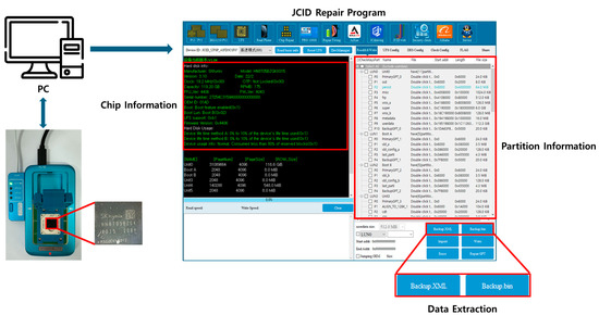 Figure 3 presents the storage chips obtained by disassembling Meta Quest 2 and Pico 4. Meta Quest 2 uses SK Hynix’s HN8T05BZGKX015 (UHD-UFS-BGA153) storage, and Pico 4 uses Samsung’s KLUDG4UHDC B0E1 (UHD-UFS-BGA153) storage. Because both devices use UFS-BGA153 storage, a JC UFS Programmer U15 reader was employed to acquire data from these chips. Figure 4 presents the process of acquiring storage data using a reader. After attaching the chip to the reader through a socket suitable for the chip type and connecting the reader to a PC, the device lights up, as shown in the bottom left of the figure. When the reader is properly connected to the PC and the JCID program is executed on the PC, the program automatically identifies the chip and provides information, as shown on the right side of the figure. The left screen of the program shows the chip information, whereas the right screen shows the chip partition information. Storage data can be saved on a PC using the backup function at the bottom of the program. The acquisition of storage data from Meta Quest 2 was successful. However, the Pico 4 chip was damaged, allowing only confirmation of the storage structure. Detailed information on the data obtained from the Meta Quest 2 storage and the structure of the Pico 4 storage is provided in Table A1 and Table A2.