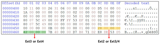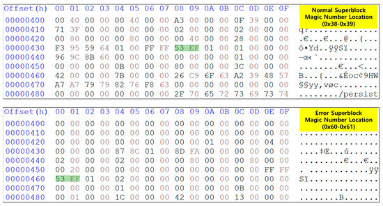 There were no problems with the filesystem data of the system partition; however, data misalignment was observed. Figure 6 presents an example of a data misalignment in the system partition. The normal position of the magic number in the Ext4 superblock is at 0 × 38~0 × 39, but in the system partition, it was located at 0 × 60~0 × 61. A similar misalignment was observed in other areas, making it impossible to accurately obtain files within the filesystem based on the offset.