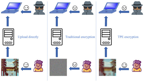 The left side is the original image uploaded to the cloud, which can be accessed directly by both the user and the outside; the center is the traditional encrypted image uploaded to the cloud, which cannot be accessed by the user or the outside; and the right side is the uploaded to the cloud after the TPE scheme, which can be accessed by the user but not by the outside.