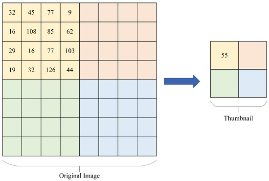 - Calculate the average value within each pixel block denoted as . The encrypted thumbnail contains only . pixel values, and the pixel values in each block are replaced by the average value.