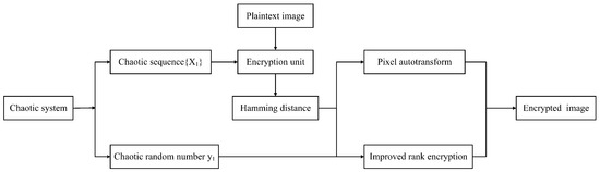 On this basis, this algorithm combines TPE with a 2D chaotic system, and it introduces the improved rank encryption algorithm when the Hamming distance or the highest sub-high bit is the same. The encryption scheme is shown in Figure 7.