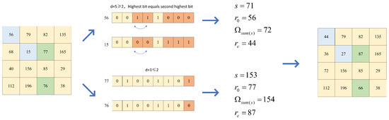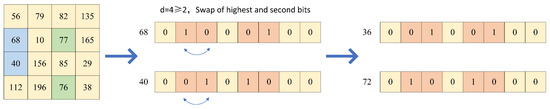 - When , judge whether the highest different bit and the second highest different bit are equal; when the two are not the same, the highest bit and the second highest bit will be self-swapped to ensure that the sum of pixel values before and after the swap is unchanged. The encryption process is shown in Figure 6.