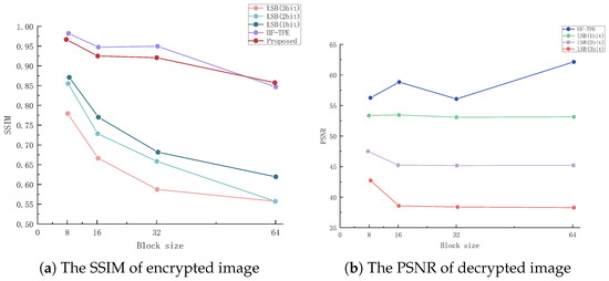 In order to evaluate the quality of the images before and after encryption and decryption, the experiments utilize structural similarity (SSIM) to assess the encrypted image and the peak signal-to-noise ratio (PSNR) to evaluate the decrypted image for distortion. A larger SSIM value and PSNR value indicate a smaller degree of image distortion. The algorithm generates the same thumbnail image before and after encryption with an SSIM value close to 1, which is an ideal state. In contrast, although the encryption values of LSB-TPE and HF-TPE are greater than 0.94, the decrypted images are distorted. Since the scheme is lossless decryption, the PSNR value of the decrypted image is infinite, as shown in Figure 8 below.