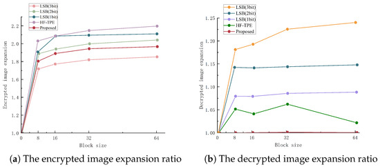 Encrypted image size is very important for image storage in the cloud; when the encrypted image occupies too much space, it will affect the image transmission and preview time. In this section, we measure the degree of expansion by the ratio of the encrypted image size to the original image size. If the value is 1, it means the encrypted image is not expanded. The expansion rate of this scheme is between 1.8 and 1.9, which effectively reduces the expansion rate of the image compared to the currently existing schemes. Since the scheme is lossless decryption, no expansion occurs in the decrypted image, i.e., the expansion rate is always 1, as shown in Figure 9.