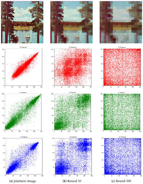 The adjacent pixel correlation method was employed to assess the correlation between neighboring pixels in an image. For this analysis, a 512 × 512 image containing a 16 × 16 pixel thumbnail block was selected. From this image, 5000 pairs of adjacent pixels were randomly chosen for correlation analysis in three directions: horizontal, vertical, and diagonal. As illustrated in Figure 10, the R, G and B channels of the plain text image exhibit a high degree of correlation in all three directions with pixel pairs closely clustered along a line. In contrast, the pixel pairs in the encrypted image are widely dispersed, leading to a significant reduction in correlation coefficients in each direction. This effectively mitigates the risk of statistical attacks.