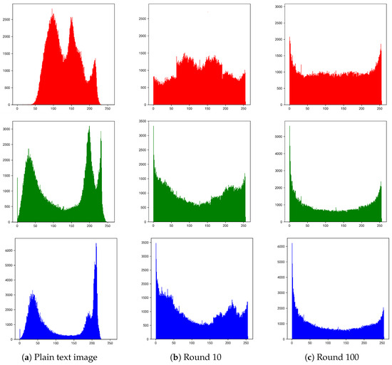 The histogram is a fundamental metric utilized to analyze the statistical properties of an image, and it has the objective of estimating the resistance of the image to a statistical analysis attack. This relates to the ability of the password to statistically break the statistical patterns of the cipher text and plain text. The experiment analyzes the histograms of the cipher text image and the plain text image, demonstrating how the distribution of each gray value in the image is visualized. The histogram of the plain text image exhibits a discernible statistical pattern and an uneven distribution across each channel. Upon statistical analysis of the intercepted cipher text image, the attacker identifies and compares the statistical patterns among them with those of the plain text. This process enables the extraction of a transformational relationship between the plain text image and the cipher text image, which is then leveraged to attack the encryption scheme and achieve the attack objective. This mode is known to not only make the histogram of a cipher text image in each channel gradually become uniform but also ensure a significant difference still exists between the cipher text and the plain text image. In order to analyze the resistance of the encryption scheme to an attack based on statistical analysis, the iterative graph variance must be considered. The histogram of the image after encryption must be as uniform as possible for statistical analysis attacks. The variance of a histogram can be employed to assess the resilience of an encryption algorithm to statistical analysis attacks. A lower variance indicates a more uniform distribution of pixels, which in turn implies reduced statistical information content in the image. This represents a more robust improvement in the secure image scheme encryption. During the experiments, we tested on a test set that included an image file with a pixel value size of 512 × 512. This is demonstrated in Figure 11, which presents the histograms of the distribution of the original image in R, G and B after both ten and one hundred iterations.