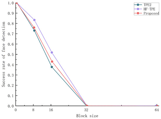 The TPE technique is a balance between availability and privacy, but the security of the images stored in the cloud is still a concern. In Figure 12, we encrypt the original images in different block sizes, and the images gradually lose their availability as the number of blocks increases. In our experiments, we select the first 500 images in the HELEN face dataset [32], use the face detection API algorithm in the Face++ platform to experiment on them, and compare them with the HF-TPE [24], TPE2 [33] scheme. The results of the experiments are shown in Figure 13, from which it can be concluded that the encryption scheme proposed in this paper has similar results to the above schemes, and with the increase in the chunks of the image, the success rate of the face detection decreases continuously, and when the image chunks are 32 × 32, the detection success rate tends to be close to 0.