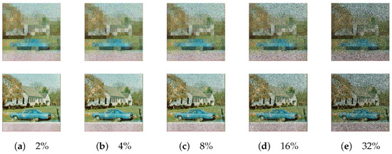 Due to the inevitable influence of various factors during transmission, including noise, distortion, and those caused by noisy communication, degradation, and pollution, the encrypted images are subject to alteration. Consequently, the image encryption algorithm must be sufficiently robust to withstand attacks in real-world scenarios. In this experiment, the encrypted image was subjected to a loss of pixels at random with the percentage of loss ranging from 2% to 32%. The results are presented in Figure 14. The image demonstrates that the attacked TPE image and the decrypted image are darkened overall. However, the information contained in the image prior to the attack is still discernible, indicating that the scheme exhibits robust resilience.