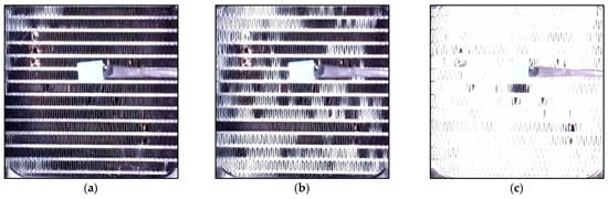 The design of HXs must account for frost formation to avoid operational issues. Without appropriate design and defrosting methods, frost buildup can restrict or, in worst-case scenarios, block airflow between fins. This leads to increased energy consumption, lower performance, degradation of refrigeration conditions, decreased product safety and quality, and potential system damage [,]. Figure 1 shows the frost formation process on the intake side of a HX. The images illustrate the sequential stages of frost development, starting from minimal accumulation (a), progressing to initial frost formation in localized regions (b), and culminating in complete blockage of the HX surface (c). This figure displays the irregular and unpredictable progressive nature of frost buildup and its potential to decrease thermal performance, emphasizing the need for effective frost management strategies in HX design and operation.