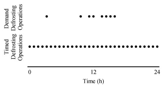 Comparison between timed and demand defrosting using the TEPS sensor. The dots indicate defrosting operations occurring only when necessary under the demand defrosting method and periodically for the timed defrosting operations [].