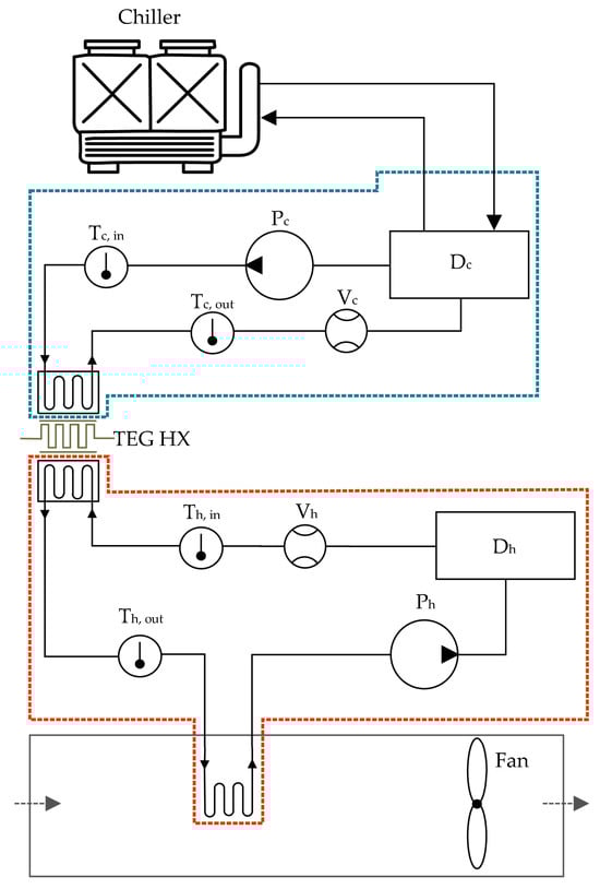The experimental setup consists of a simulated HX such as those in the liquid-to-suction line found in refrigeration systems, used to superheat the gas and subcool the liquid. In this experiment, a liquid-to-liquid HX configuration was utilized. The working fluid circuit and its components are represented in Figure 3. The cold circuit (blue dashed line) consists of a chiller, reservoir (), intake () and outlet () temperature sensors, pump (), and flow meter (). Liberated heat from the hot circuit (red dashed line) is transferred through the TEG HX and absorbed by the cold circuit. The hot circuit includes an air tunnel with another HX and air temperature control, intake () and outlet () temperature sensors, pump (), and flow meter ().