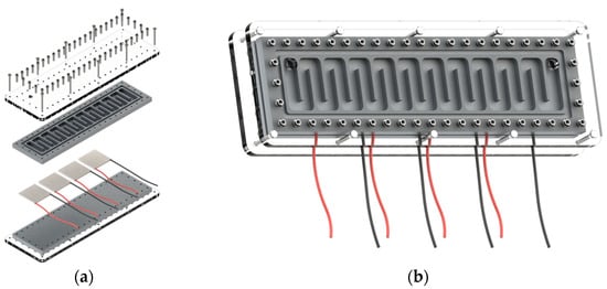 Exploded (a) and assembled (b) view of the TEG HX, showing the four Peltier cells, machined aluminum plates, lids, and fixtures.