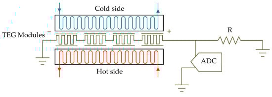 The four Peltier cells were connected in series, as depicted in the schematic in Figure 5. This series configuration was further connected to a resistor, with a microcontroller whose ADC is used to measure the voltage drop across the resistor terminals with an accuracy of ±9.8 mV. For each test, a series of different resistors ranging from 0.78 Ω up to 14,861.44 Ω were tested to determine the maximum TEG power output. The resistance values for each resistor tested were measured, including wiring resistance, with an accuracy of ±(0.05% of the reading + 1 LSD).