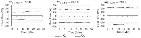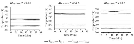 Figure 6 shows the inlet and outlet temperatures of the working fluids across all the three tests. The inlet temperature on the cold side of the TEG HX remained constant at an average of 269.5 K, with a standard deviation of 0.17 K. Conversely, the inlet temperature on the hot side was modulated as the variable parameter across the tests. This parameter underwent incremental adjustments of 12.7 K and 14.6 K, respectively. Consequently, these adjustments yielded average temperature differentials between the hot and cold sides of the TEG HX () of 16.3 K, 27.6 K, and 39.8 K, with standard deviations of 0.28 K, 0.23 K, and 0.48 K, respectively, for the three tests. The different experiments aim to simulate conditions like those found in different regions of refrigeration systems, as discussed in Section 2.