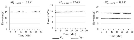 The experimental tests conducted comprised three distinct 30 min intervals, each executed within a stable regime, after the system reached thermal equilibrium and operated in a non-transitional state. During this period, inlet and outlet working fluid temperatures (, , , and ), volumetric flow in the hot and cold sides ( and ), and power generated in the TEG () were measured and registered at 3 s intervals for both the cold and hot sides of the TEG HX.