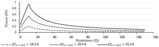 The power generated by the TEG during the tests is presented in Figure 8. The maximum generated power () values of 0.20 W, 0.53 W, and 0.93 W were obtained for the respective tests with a resistance value () of 10.61 Ω. This graph illustrates the relation between the resistive load and power generation for the different temperature differentials and a relatively low electrical output of the TEG under the given experimental conditions. Though resistance values were tested up to 14,861.44 Ω, only power measurements with R values up to 149.82 Ω are presented in Figure 9. Beyond this threshold, power generation slowly tends to zero ( values for R = 14,861.44 Ω were 0.00021 W, 0.00056 W, and 0.00101 W). Nonetheless, it is observed that as expected, for every resistance value, power increases with temperature difference, highlighting the TEG’s capability to convert temperature differentials into electrical energy.