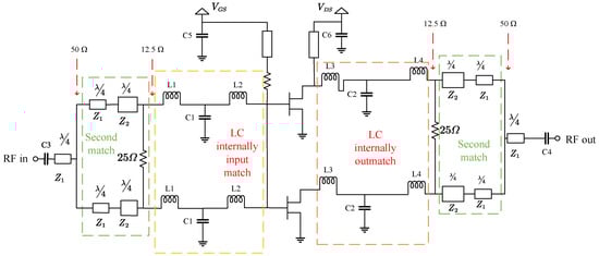The size of the power amplifier circuit is one of its important parameter indicators. Traditional externally matched PA can achieve high power and efficiency easily, but the shortcoming is the circuit size. A monolithic Microwave Integrated Circuit (MMIC) power amplifier is a PA integrated on a single semiconductor chip, characterized by its miniaturization and high integration []. However, the manufacturing process of MMIC power amplifiers is complex and costly, and their power output and efficiency are inferior to those of traditional externally matched power amplifiers. Therefore, researchers have proposed internally matching power amplifiers with a high dielectric constant and high-thermal-conductivity dielectric substrates as well as gold-wire bonding technology [,]. Such a power amplifier can achieve similar power and efficiency to a traditional externally matched power amplifier in a very small area.