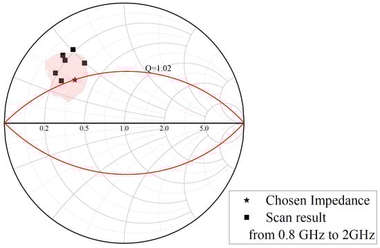 A higher Q factor means narrow bandwidth and low loss, while a lower Q factor means wide bandwidth and more loss. To extend the operation bandwidth, a trade-off of output power, PAE, and Q is performed. The impedance of the input and output matching network should be chosen more easily by a low Q factor matching network. But the impedance should not leave the high PAE zone, which is given in the red area in Figure 2. The chosen out-matching impedance is 16.6 + 17j . A similar process is performed for input matching impedance. The input matching impedance is 8.14 + 5.4j .
