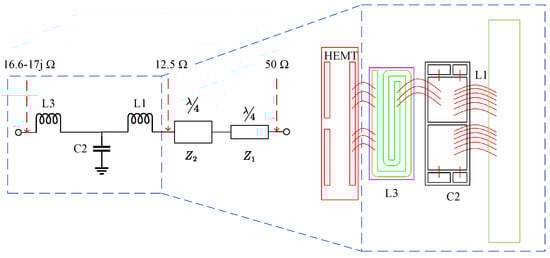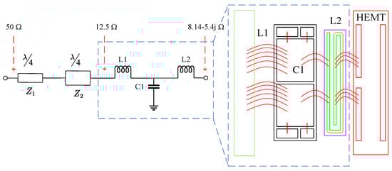 A schematic diagram of the input matching network and layout of the LC input matching network is shown in Figure 3.  is the equivalent inductance of a set of gold bonding wires, where the typical value of inductance is 200 pH.  pf is implemented by a film capacitor whose size is  mm. It can be seen in Figure 3 that there are four small pads for tuning the value of .  nH, which is implemented by the spiral inductor. The wire-spiral inductance is implemented by a transmission line, which is made by gold. Under the gold layer, there is a layer of nickel that is used to assist in welding it onto the substrate. And the size of L2 is  mm. The circuit components are connected by gold bonding wire. The LC network transforms the impedance from 12.5  to the ideal input conjugate impedance 8.14 − 5.4j . The remaining two  micro-strip lines are part of the power divider. The different characteristic impedances make the bandwidth of the impedance transformation circuit wider, which will be further discussed in the following section. The characteristic impedance of  is 33 . The characteristic impedance of  is 16 .
