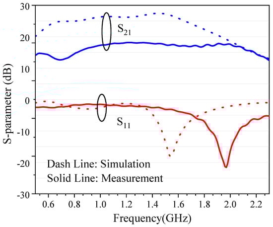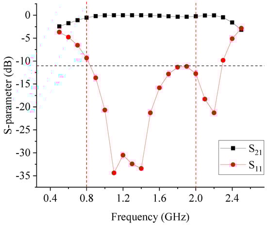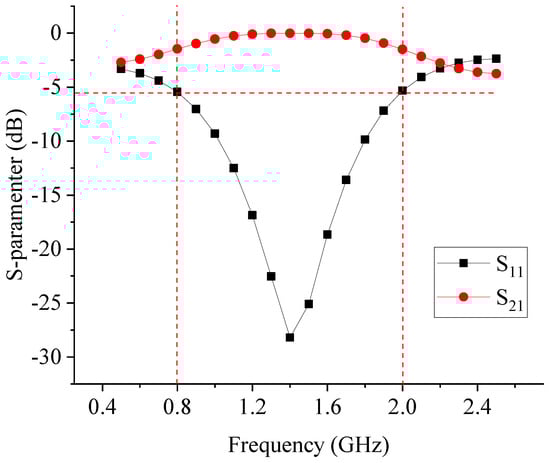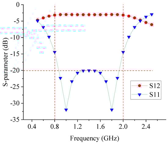 The simulation result of the output matching network is given in Figure 6. The simulation terms are the objective load matching impedance. Both S11 and S21 show a good operation frequency bandwidth from 0.8 GHz to 2 GHz. S21 is larger than −1.5 dB during the whole objective frequency range.
